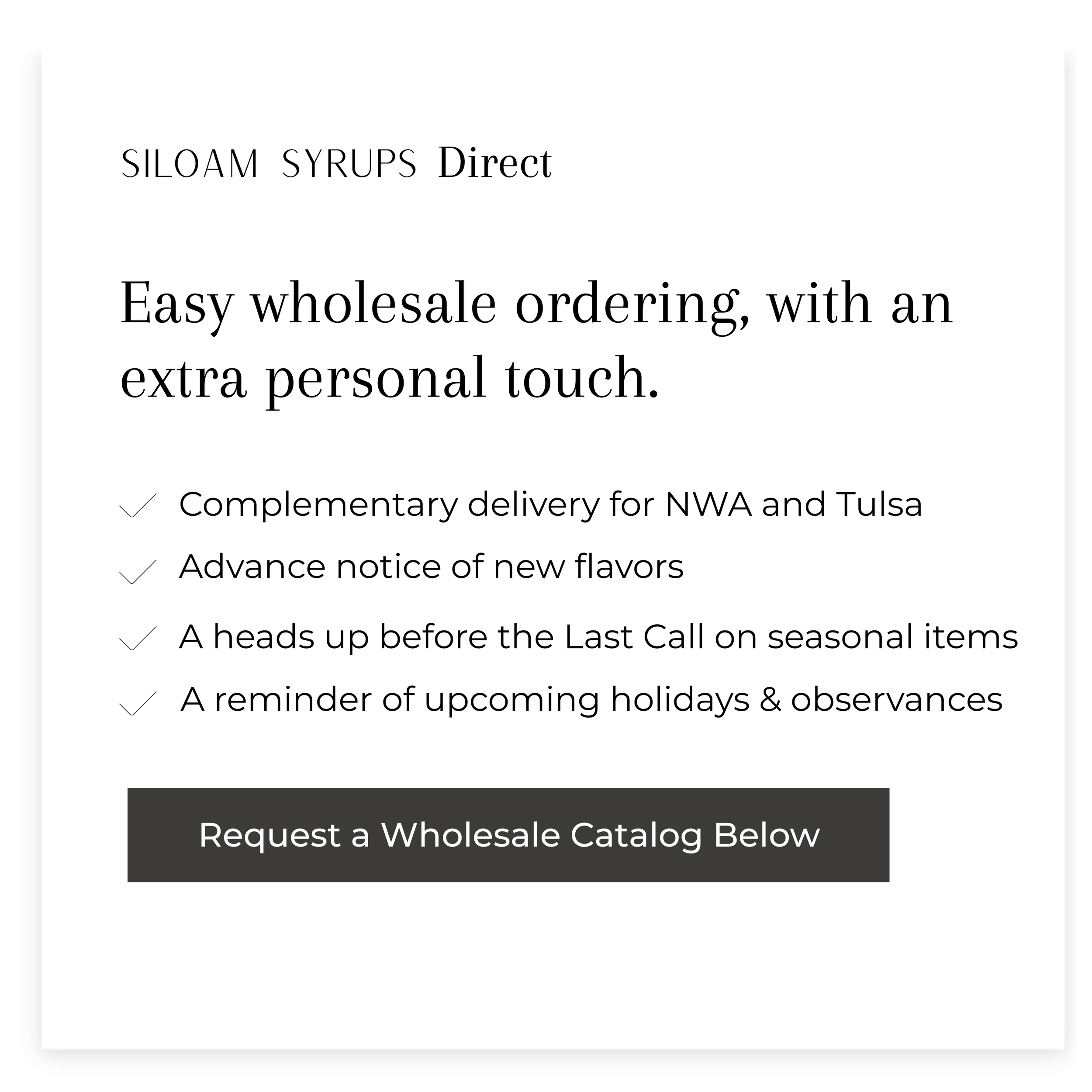Thank you for your interest in a wholesale account with Siloam Syrups! When purchasing wholesale for your business, Siloam Syrups offers two pathways - direct with Siloam Syrups and through the Faire online marketplace. Both options come with their own benefits, perfect for your unique business needs!
